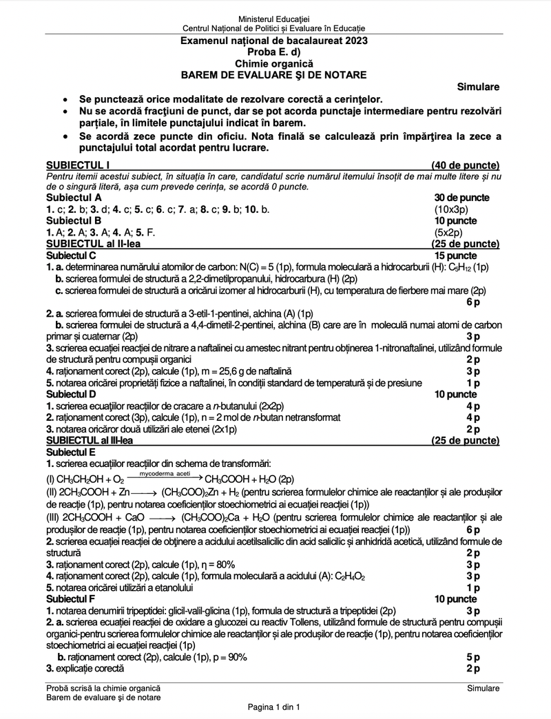 2 din 9 | Simulare BAC 2023 subiecte Chimie. Modele de subiecte și baremul de corectare