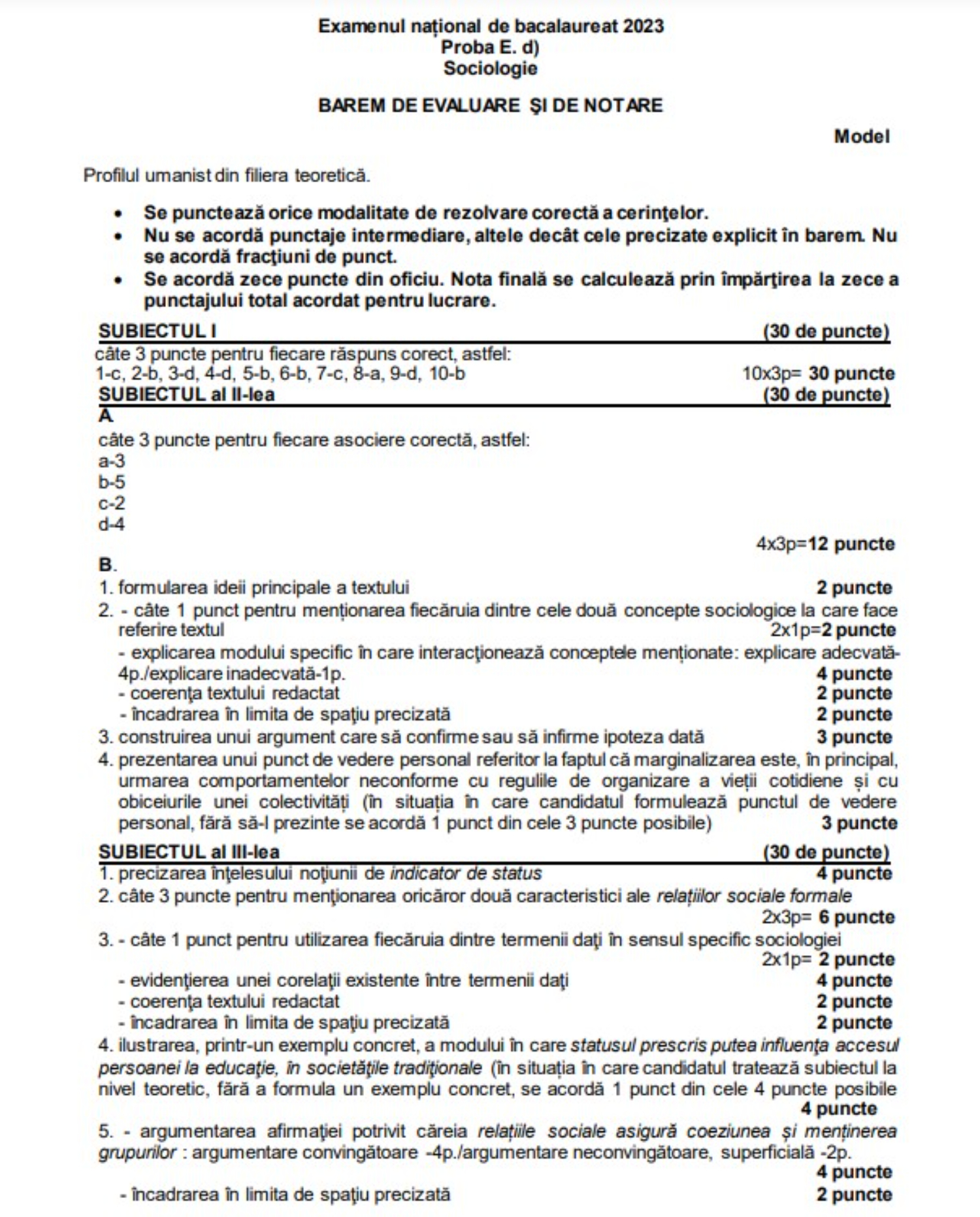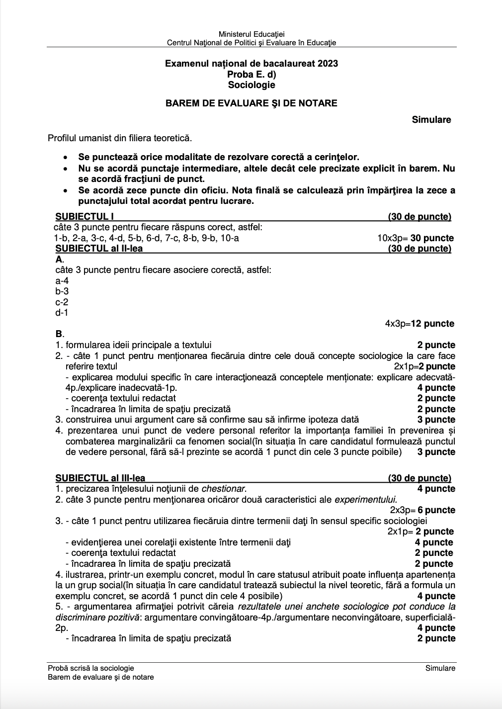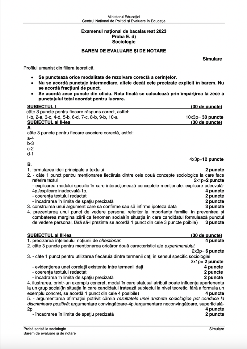 UPDATE. Iată subiectul și baremul de corectare la simularea de Sociologie 2023!