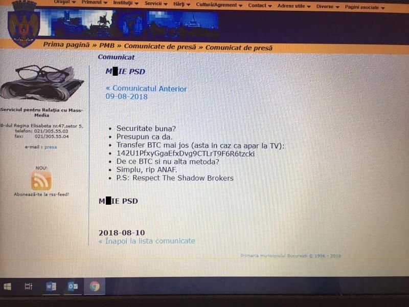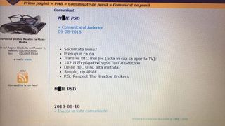 "Securitate buna? Presupun ca da. Transfer de BTC mai jos (asta in caz ca apar la TV). De ce BTC si nu alta metoda? Simplu, RIP ANAF. PS: Respect The Shadow Brokers", este mesajul care a aparut in comunicat.