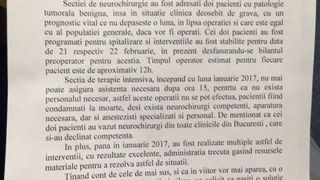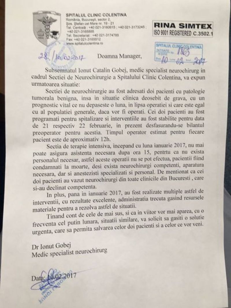 "Dragi pacienti, prieteni si oameni de bine, autoritati ale statului, va vorbesc din calitatea mea de neurochirurg la Spitalul Clinic Colentina, cerandu-va ajutor, fiecare asa cum va pricepeti sa il oferiti.