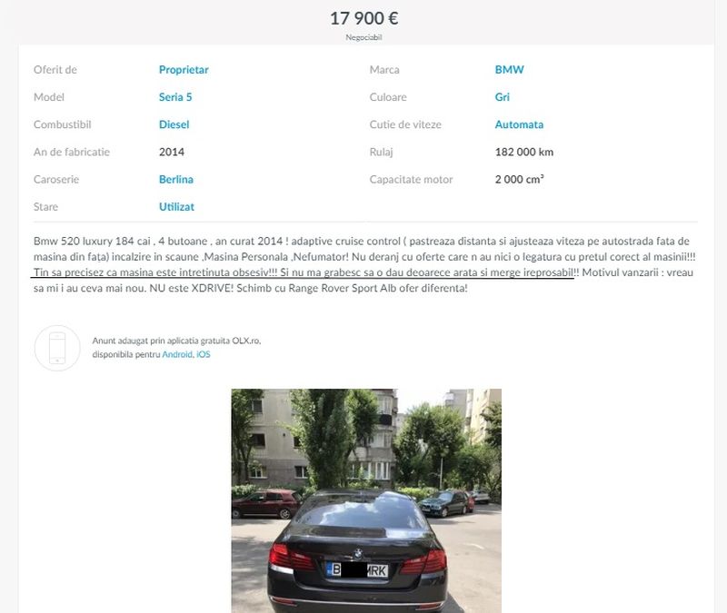 ”BMW 530 luxury, 4 butoanem an curat 2014! Adaprive cruise control (păstrează distanța și ajustează viteza pe autostradă față de mașina din față), încălzire în scaune. Mațină personală, nefumător! Nu deranjați cu oferte care n-au nici o legătură cu prețul corect al mașinii!!! Țin să precizez că mașina este întreținută obsesiv!!! Și nu mă grăbesc să o dau deoarece arată și merge ireproșabil!!! Motivul vânzări: vreau să-mi iau ceva mai nou. Nu este X-Drive. Schimb cu Range Rover Sport Alb, ofer diferența!”, scria proprietarul mașinii.