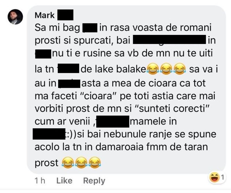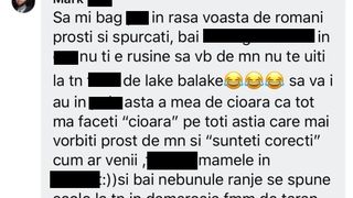 ”Să-mi bag... în rasa voastră de români proști și spurcați, băi b... f... în c..., nu-ți e rușine să vorbești de mine, nu te uiți la tine f... de lake balake. Să vă iau în... asta a mea de cioară că tot mă faceți ”cioară” pe toți ăștia care mai vorbiți prost de mine și ”sunteți corecți” cum ar veni, f...