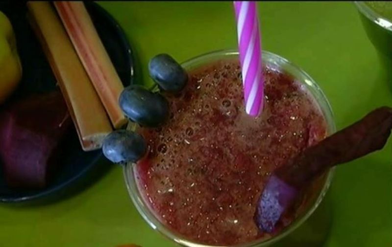 Pentru un smoothie hidtratant punem in blender cateva bucati de rubarba, fructe de padure si lapte de migdale, apoi mixam totul foarte bine.