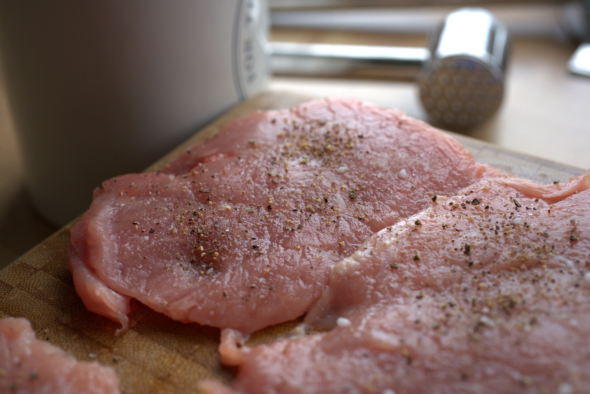 Carnea se pune intre doua pungi de nylon solide si se bate cu un ciocan plat, fara zimti (excrescente). Daca nu aveti asa ceva puteti bate snitelele cu o cana metalica sau cu un ibric. Carnea nu se bate foarte tare, dar se bate pe ambele parti. Nu e voie sa zdrobim fibrele carnii sau sa subtiem feliile prea mult. Ele trebuie sa aiba macar 0,4 – 0,5 cm grosime.