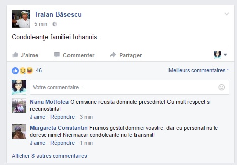 Fostul presedinte Traian Basescu a transmis condoleante familiei prezidentiale.