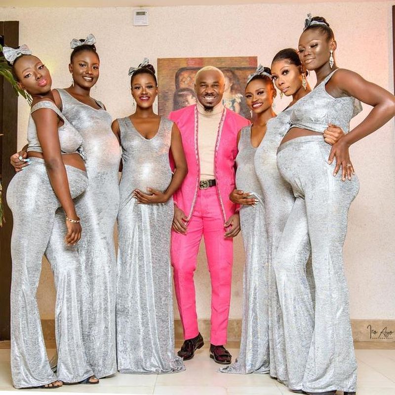 După cum puteți vedea mai jos nigerianul a apărut înconjurat de șase femei frumoase îmbrăcate în ținute argintii etalându-și toate cu mândria sarcina.