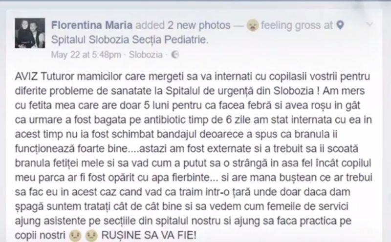 "Are mana bustean. Ce ar trebui sa fac intr-o tara unde doar daca dam spaga suntem tratati cat de cat bine", a mai scris mamica pe Facebook.