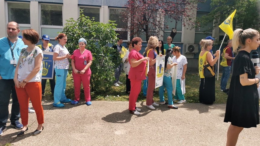 Angajații din sistemul sanitar au protestat joi și au cerut majorări salariale pentru personalul mediu, dar și majorarea tarifului pentru gărzile suplimentare efectuate de medici în spitalele publice. În același timp, angajații au anunțat că nu vor renunța la proteste, iar pe 27 iunie va avea loc o grevă de avertisment, urmată de o grevă generală, începând cu data de 1 iulie.