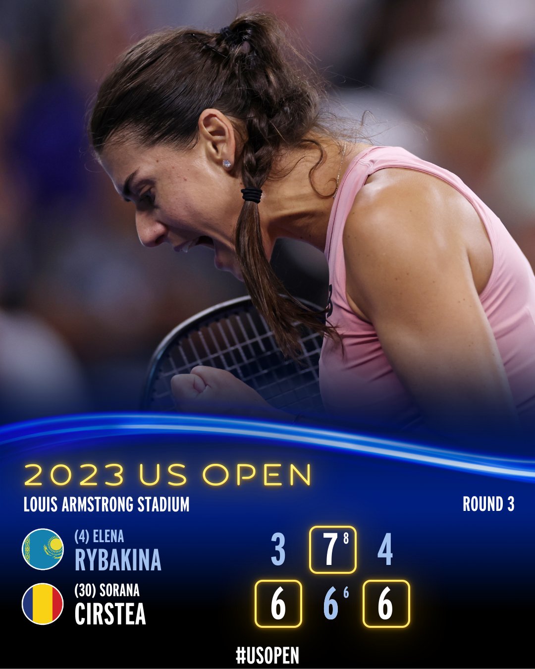 Rîbakina (24 ani), campioană la Wimbledon în 2022, nu a depăşit niciodată turul al treilea la New York. Kazaha a câştigat ambele meciuri anterioare cu Sorana Cîrstea, în 2020, în primul tur la Doha, cu 3-6, 6-3, 6-1, şi în primul tur la Roland Garros, cu 6-0, 6-3.