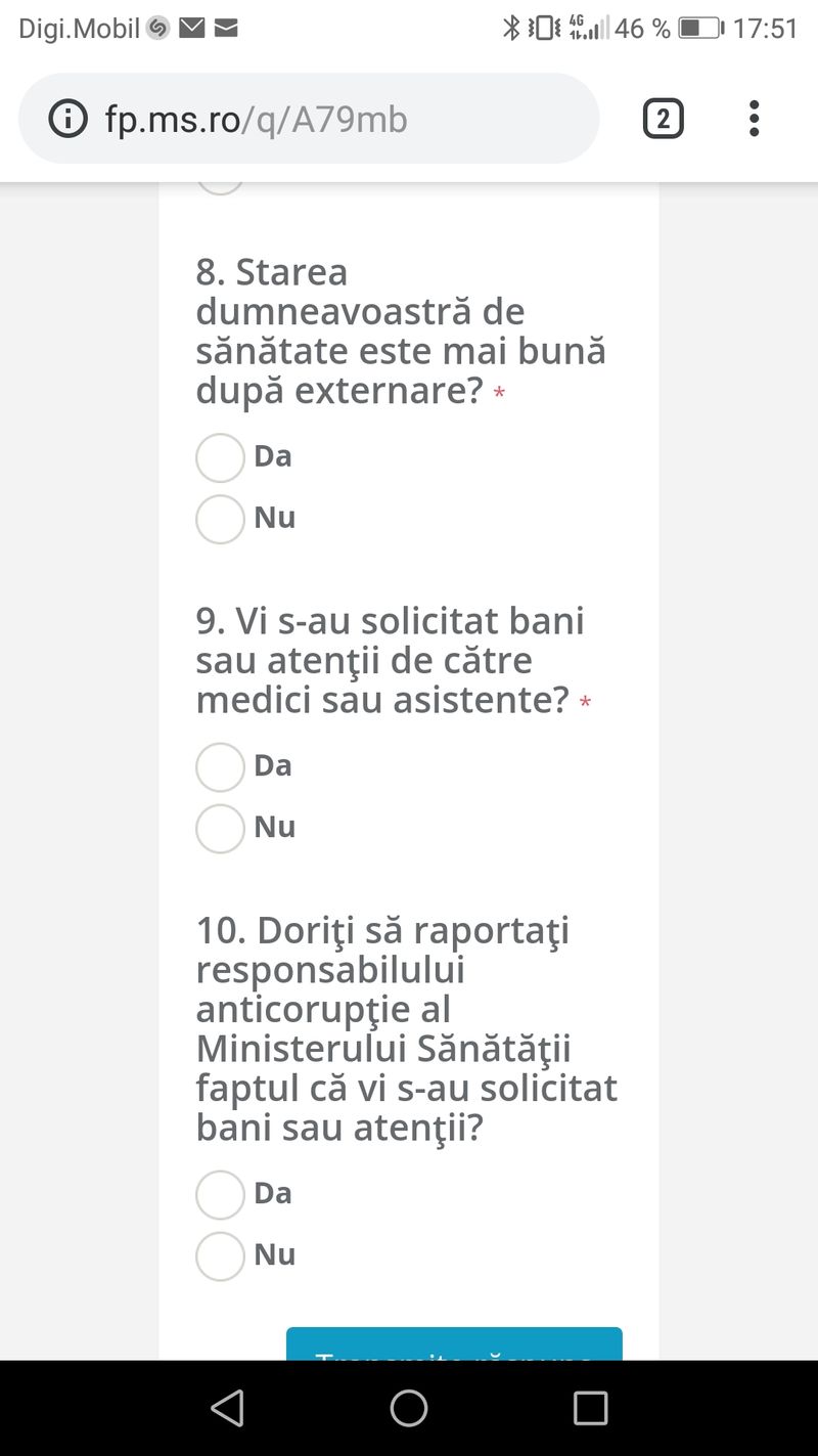 ”Vi s-au solicitat bani sau atenţii de către medici sau asistente?”, este una dintre întrebări.