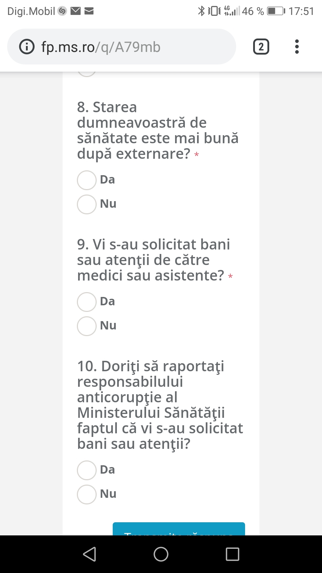”Doriţi să raportaţi responsabilului anticorupţie al Ministerului Sănătăţii faptul că vi s-au solicitat bani sau atenţii?”, este o altă întrebare.