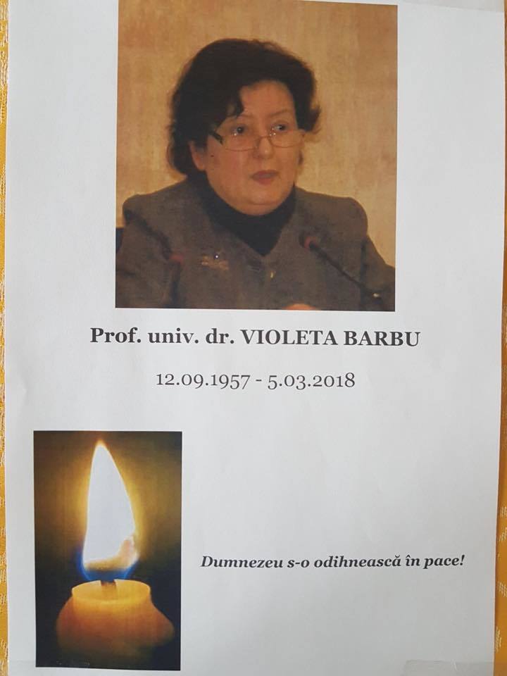 „Dragi prieteni, va aduc la cunostinta ca luni, 5 martie 2018, a trecut la cele vesnice prof. univ. dr. Violeta Barbu. Indurerati de aceasta veste prea trista, dar si insufletiti de speranta crestina in inviere, studentii si profesorii Facultatii de Teologie Romano-Catolica, Universitatea din Bucuresti, precum si membrii altor institutii academice si religioase din Bucuresti si din tara se roaga pentru iertarea pacatelor si odihna ei vesnica.