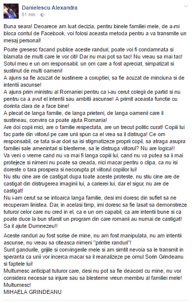 "Buna seara! Deoarece am luat decizia, pentru binele familiei mele, de a-mi bloca contul de Facebook, voi folosi aceasta metoda pentru a va transmite un mesaj personal!Poate gresesc facand publice aceste randuri, poate voi fi condamnata si blamata de multi care le vor citi! Dar nu mai pot sa tac! Nu vreau sa mai tac! Sotul meu e un om responsabil, un om care a fost apreciat, simpatizat si sustinut de multi oameni! A ajuns sa fie acuzat de sustinere a coruptiei, sa fie acuzat de minciuna si de intentii ascunse! A ajuns prim ministru al Romaniei pentru ca i-au cerut colegii de
