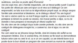 partid si nu pentru ca a avut el intentii sau ambitii ascunse! A primit aceasta functie cu dorinta clara de a face bine!A plecat de langa familie, de langa prieteni, de langa oamenii care il sustineau, convins ca poate ajuta Romania!Are doi copii mici, are o familie respectata, are un trecut politic curat! Copiii lui fac parte din viitorul pe care unii spun ca el vrea sa il distruga! Ce om responsabil, ce tata si-ar dori sa isi stigmatizeze proprii copii, sa atraga asupra familiei sale amenintari si blesteme, sa le distruga viitorul? Nu are logica!! Va veni o vreme cand nu va mai fi langa copiii lui, cand nu va putea sa ii mai protejeze si nimeni nu poate sa creada, nici macar pentru o clipa, ca nu isi doreste o tara prospera si necorupta pt viitorul copiilor lui! Nu stiu cine are de castigat dupa toate aceste proteste, nu stiu cine are de castigat din distrugerea imaginii lui, a carierei lui, dar el sigur, nu are de castigat! Nu i-am cerut sa se intoarca langa familie, desi imi doresc din suflet sa ne recuperam linistea. Dar, in acelasi timp, imi doresc sa fie lasat sa demonstreze tuturor celor care nu cred in el, ca e un om capabil, ca are intentii bune si ca poate duce la bun sfarsit un program din care romanii au numai de castigat! Sa il ajute Dumnezeu!!Aceste randuri au fost scrise de mine, nu am fost manipulata, nu am intentii ascunse, nu vreau sa citeasca nimeni "printre randuri"! Sunt gandurile, grijile si convingerile mele si am simtit nevoia sa le transmit in speranta ca unii vor incerca macar sa il reanalizeze pe omul Sorin Grindeanu si faptele lui! Multumesc anticipat tuturor care, desi nu pot sa fie deacord cu mine, nu vor considera necesar sa injure sau sa blesteme vreun membru al familiei mele! Multumesc! MIHAELA GRINDEANU"