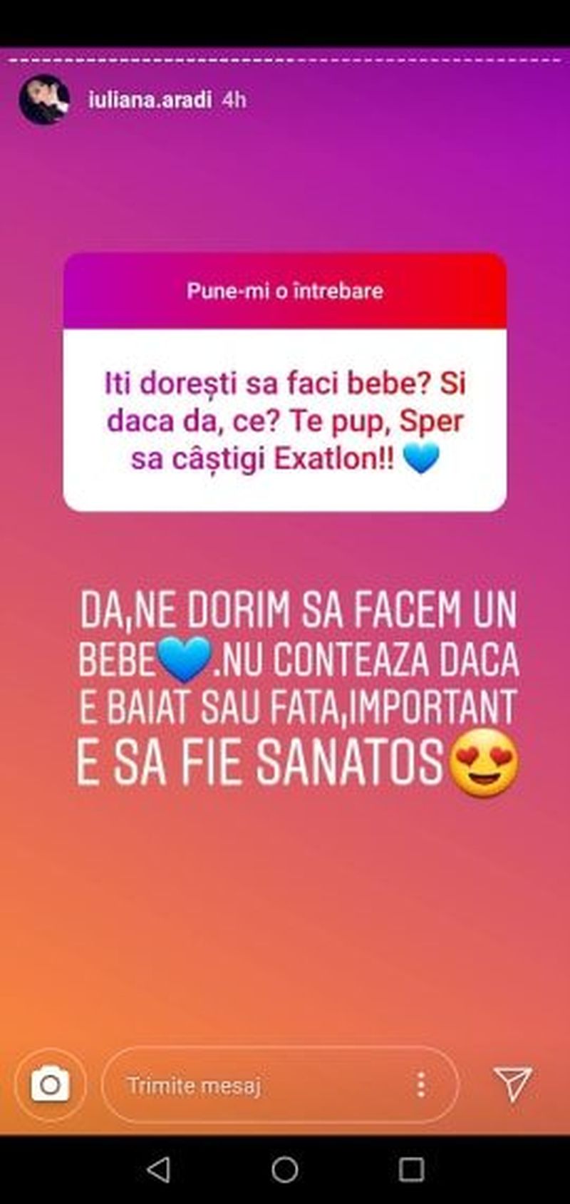 Pasionata de sport si de viata sanatoasa, Iuliana a intrat in competitia "Exatlon" pentru a dovedi ca poate sa se adapteze intr-un concurs extrem de dur si, de asemenea, ca toate antrenamentele de pana acum i-au calit atat trupul, cat si spiritul.