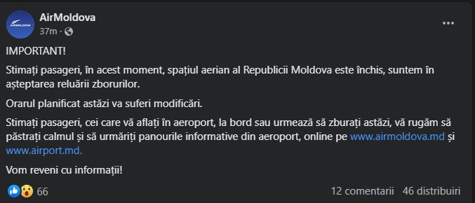 Publicația de la Chișinău, care citează canalul de telegram @runway09, spune că decizia de a închide spațiul aerian a fost luată din motive de securitate. ”Stimați pasageri, cei care vă aflați în aeroport, la bord sau urmează să zburați astăzi, vă rugăm să păstrați calmul și să urmăriți panourile informative din aeroport, online pe www.airmoldova.md și www.airport.md”, a anunțat și compania Air Moldova.