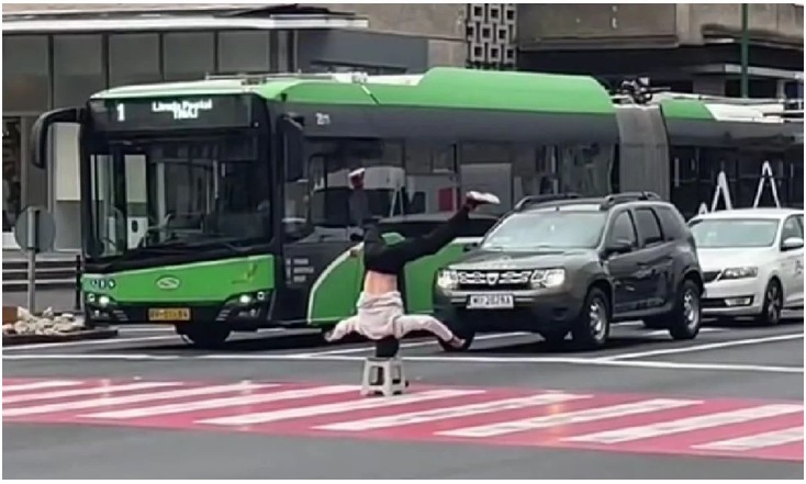 Imaginile au ajuns în presa locală din Braşov după ce o persoană l-a filmat pe tânăr în timp ce stă în cap şi face echilibristică pe un scaun amplasat pe trecerea pentru pietoni. Filmulețul a devenit viral pe TikTok.