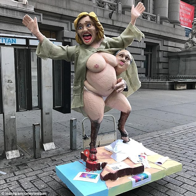 Statuia o infatiseaza pe Hillary Clinton goala, iar alaturi sta un barbat, pe care artisul l-a descris ca fiind un bancher de pe Wall Street, care o saruta pe sani. O