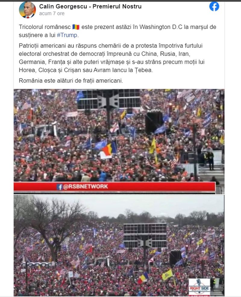 „Tricolorul românesc este prezent astăzi în Washington D.C la marşul de susţinere a lui #Trump. Patrioţii americani au răspuns chemării de a protesta împotriva furtului electoral orchestrat de democraţi împreună cu China, Rusia, Iran, Germania, Franţa şi alte puteri vrăjmaşe şi s-au strâns precum moţii lui Horea, Cloşca şi Crişan sau Avram Iancu la Ţebea.