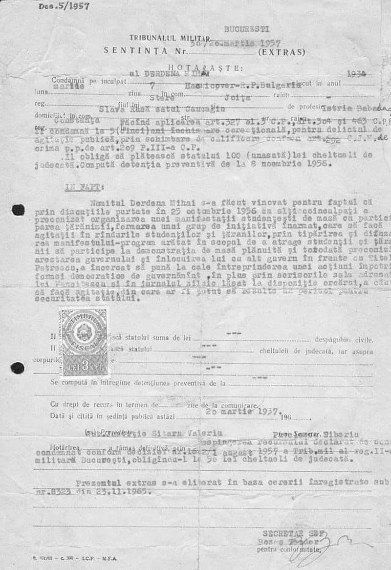 In timp ce era student la Facultatea de Ziaristică din cadrul Universității București, a fost exmatriculat din anul IV, din cauza participării la manifestațiile anticomuniste. (Vezi Mișcările studențești din București din 1956). Arestat la 8 noiembrie 1956, a fost anchetat de către Căpitanul Gheorghe Perlea, căpitanul Nicolae Comănescu, locotenentul-major Mihai Necula, locotenentul-major Constantin Iacob și locotenentul Eugen Lazăr. Mihai Derdena a fost condamnat prin sentința 302 din 27 februarie 1957 a Tribunalului Militar București la 5 ani de închisoare pentru crima de uneltire contra ordinii sociale.