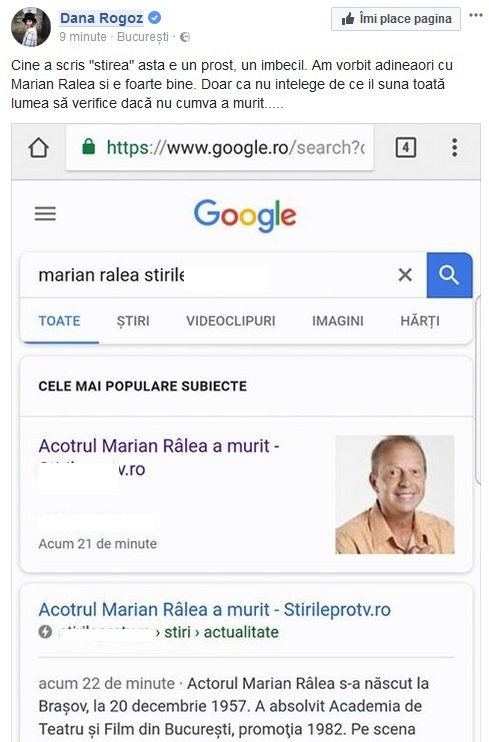 "Cine a scris "stirea" asta e un prost, un imbecil. Am vorbit adineaori cu Marian Ralea si e foarte bine. Doar ca nu intelege de ce il suna toată lumea să verifice dacă nu cumva a murit...",