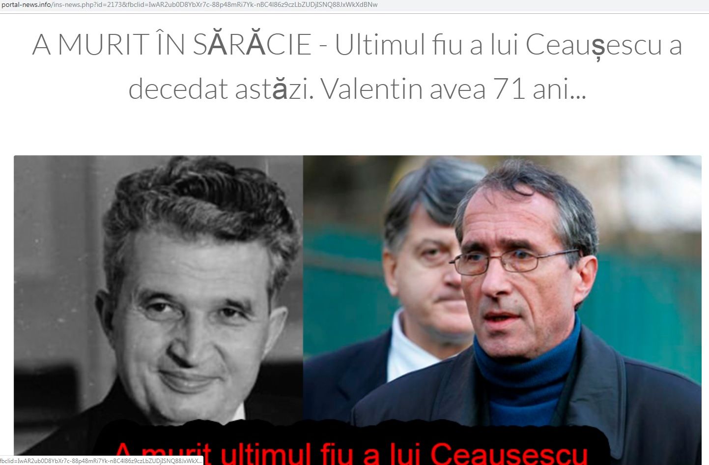 Informația că Valentin Ceaușescu a murit astăzi, 11 august, a circulat foarte mult pe internet. Site-ul portal-news.info a publicat informația incredibilă, care a strâns sute de share-uri și de mesaje de condoleanțe într-un timp record. Titlul articolului este ”A murit în sărăcie- Ultimul fiu al lui Ceaușescu a decedat astăzi. Valentin avea 71 de ani..”, iar textul era următorul:
