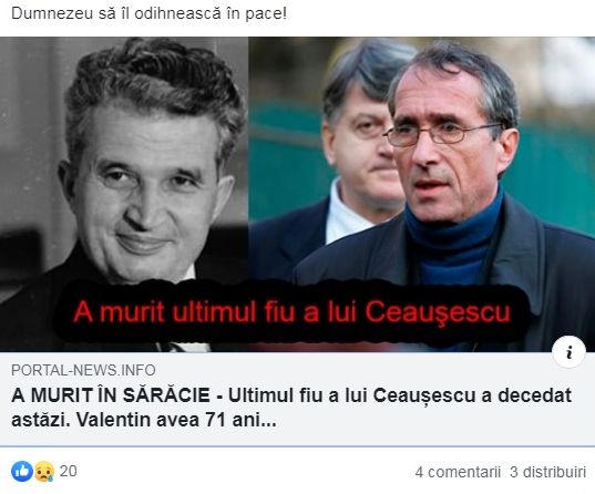 3 din 4 | Știrea falsă care astăzi a șocat internetul: ”Ultimul fiu al lui Ceaușescu a decedat astăzi. Valentin avea 71 ani” Adevărul din spatele informației