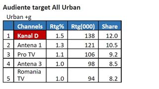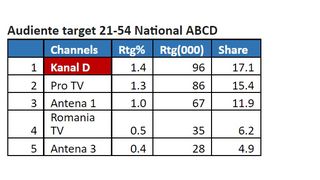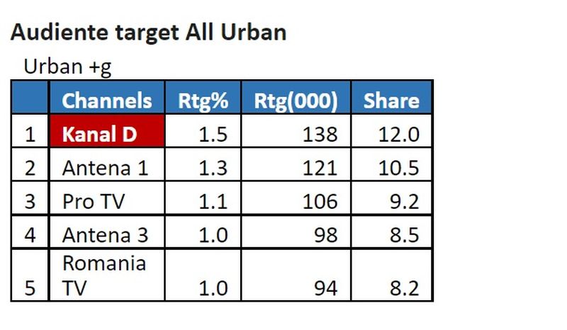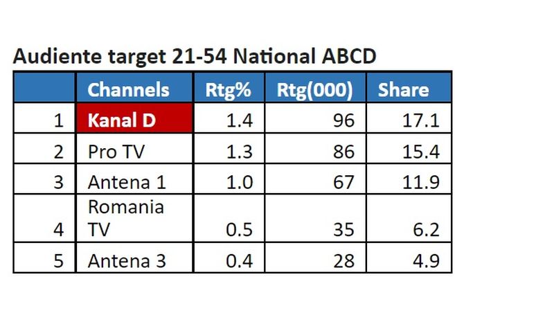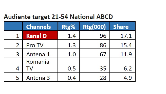Marți, în intervalul de difuzare 12:00 – 13:00, Kanal D s-a clasat pe primul loc pe toate targeturile, înregistrând 1.9% puncte de rating, și 15.3% cotă de piață, în rândul publicului din întreaga țară, 1,5% rating și 12.0% cotă de piață, în rândul publicului de la orașe, și 1.4% rating și 17.1% cotă de piață, pe targetul Comercial (21-54 Național ABCD), conform datelor furnizate de Kantar Media.