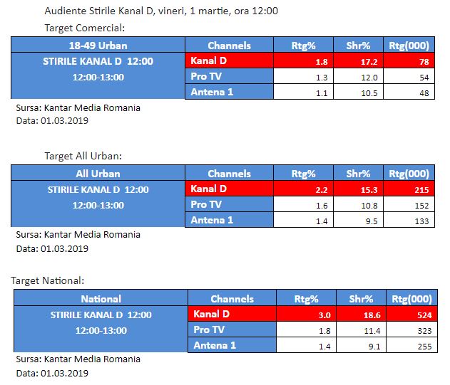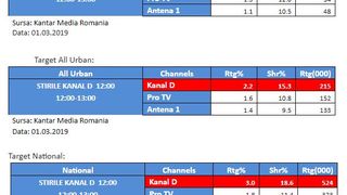 In prima zi a lui martie “Stirile Kanal D” de la ora 12:00, au pozitionat Statia Kanal D pe primul loc in topul televiziunilor din Romania, pe toate segmentele de piata.