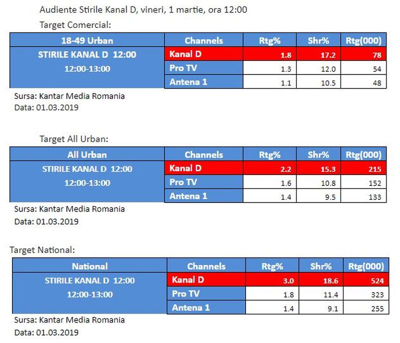 Astfel, pe targetul Comercial, in intervalul 12:00-13:00, Kanal D a acumulat 1,8% puncte Rtg si 17,2% cota de piata, pe targetul All Urban, 2,2% puncte de rating si o cota de piata de 15,3%, iar pe targetul National, Kanal D a atins 3,0% puncte de rating si 18,6% cota de piata, surclasand statiile concurente.