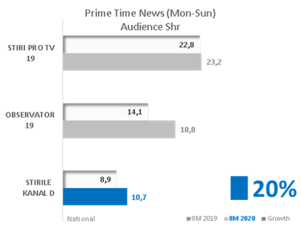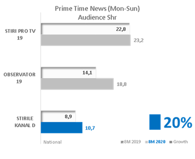 Vezi mai mult cu Știrile Kanal D! Stirile Kanal D din Prime Time, creștere de 20% a cotei de piață la nivel Național în primele opt luni ale anului în curs! Știrile prânzului își mențin poziția de lider.