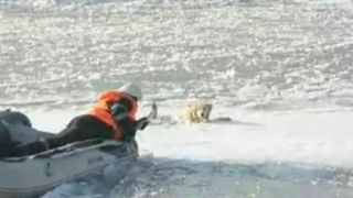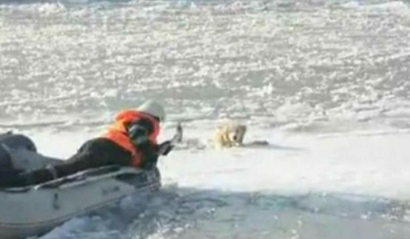 Pompierii au pornit cu o barca catre locul in care era prins animalul, dar drumul pana la acesta nu a fost deloc usor. Salvatorii au inaintat greu, din cauza bucatilor mari de gheata de la suprafata apei.
