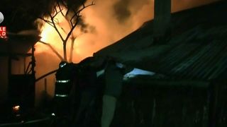 Si pompierii s-au luptat mult cu flacarile. Ajutat de localnici care tineau tabla de pe acoperisul acestei cladiri, pompierul incerca sa opreasca flacarile care s-au extins cu repeziciune.