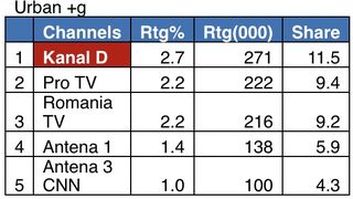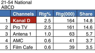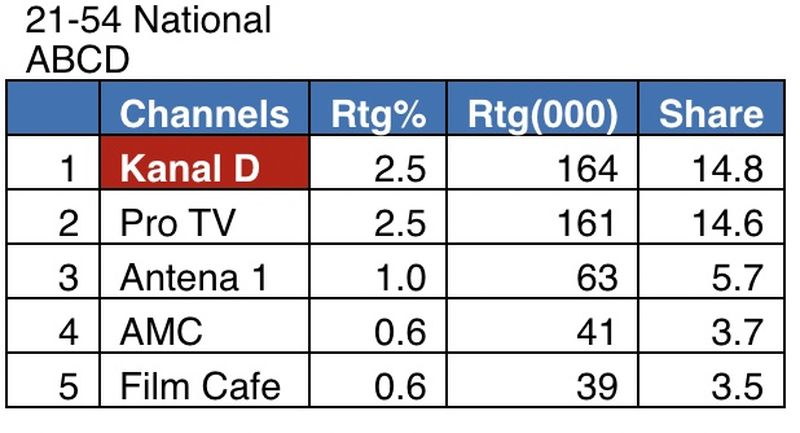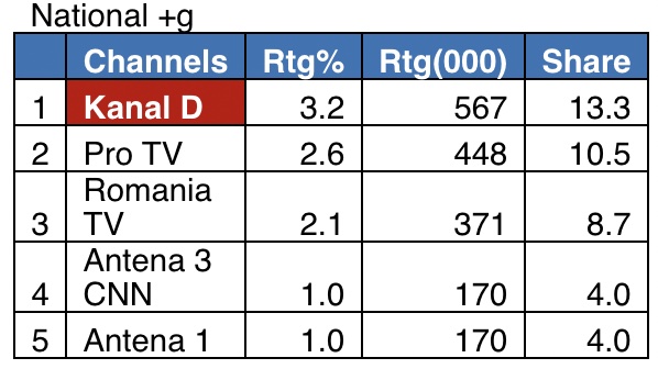 Ieri, în intervalul 18:00 – 19:00, Kanal D a fost lider de piață, cu principalul jurnal al zilei, înregistrând 3,2% rating si 13,3% cota de piață, pe targetul Național, 2,5% rating si 14,8% cota de piata, pe targetul Comercial (21-54 Nat ABCD), si 2,7% rating si 11,5% cota de piata, pe targetul All Urban.