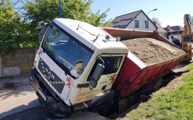 O stradă din Brașov a cedat din cauza unui camion încărcat cu nisip.