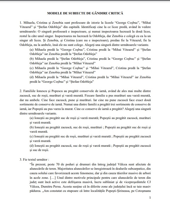 Model subiect Gândire Critică: „Familiile Ionescu şi Popescu au pregătit conservele de iarnă, având de ales mai multe dintre zacuscă, suc de roşii, murături şi varză murată. Fiecare familie a pus murături sau varză murată, dar nu ambele. Cine face zacuscă, pune şi murături. Iar cine nu pune zacuscă face exact două sortimente de conserve de iarnă. Numai una dintre familii a pregătit trei sortimente de conserve de iarnă, iar Popeştii au pus varza la murat.