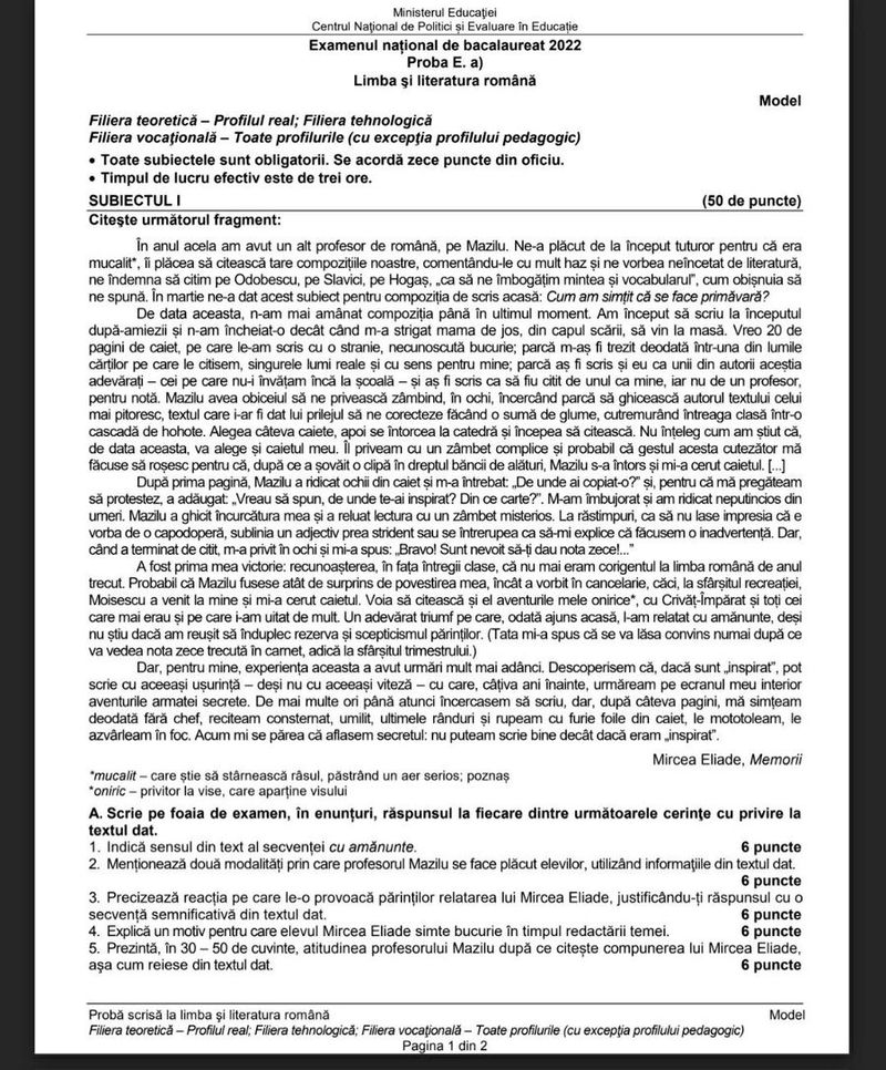 Subiecte BAC 2022 Română EDU.RO. Ce text au avut de analizat elevii. Baremul de corectate, pe EDU.ro