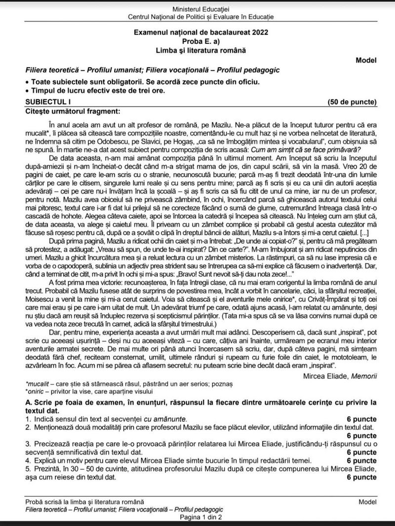 - 16 august 2022 Limba și literatura română — proba E.a) — proba scrisă