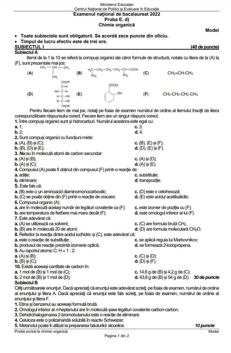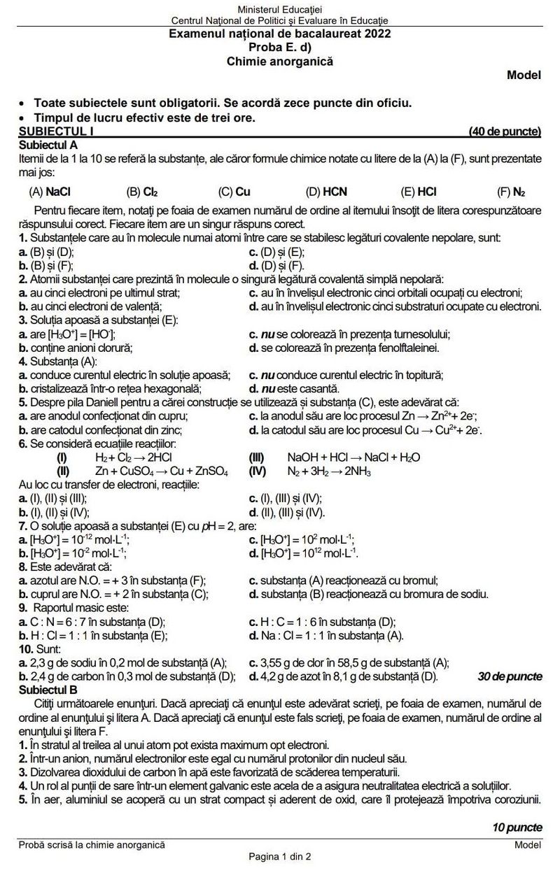 Subiecte Chimie BAC 2022. Examenul începe la ora 09:00 şi se va încheia la ora 12:00. Subiectele vor fi disponibile imediat după terminarea probei, iar baremul de corectare va fi publicat pe subiecte.edu.ro/2022/bacalaureat/Subiecte_si_bareme la ora 15:00.