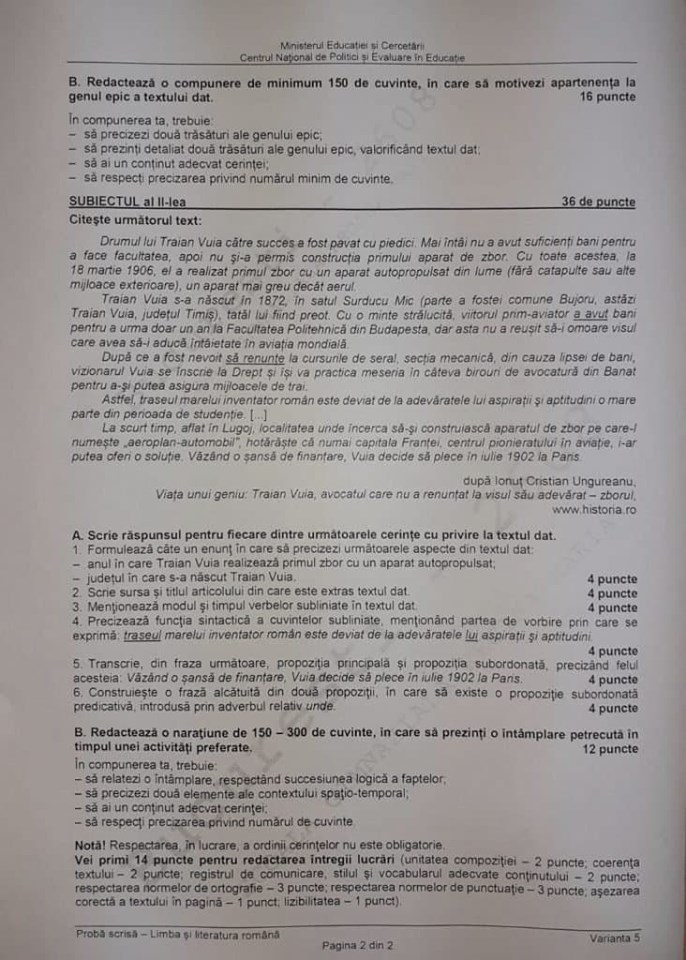 Subiectele de la română pe care le-au avut de rezolvat în această dimineață candidații la Evaluarea națională 2020 au respectat structura subiectelor de examen din anii trecuți. Absolvenții de clasa a VIII-a au la dispoziție 2 ore pentru a rezolva subiectele de mai jos. În această dimineață, la examenul scris de Limba și literatura română a fost extrasă varianta nr. 5 de subiecte.