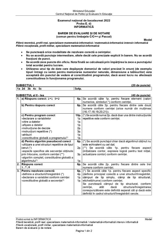 Vezi modelele de subiecte și baremul cu rezolvările corecte, publicate pe Edu.ro, pentru simulare BAC 2022 la Informatică!