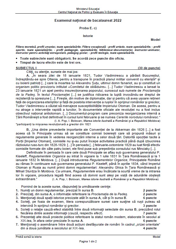 Subiecte Istorie BAC 2022