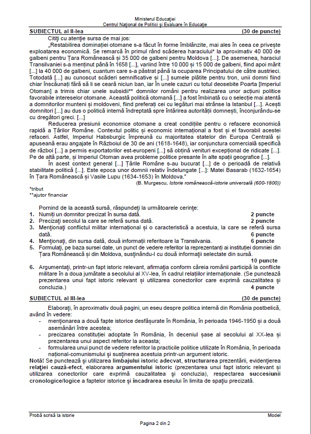 2 din 4 | Examenul Național de Bacalaureat: proba obligatorie a profilului, disciplina Istorie.