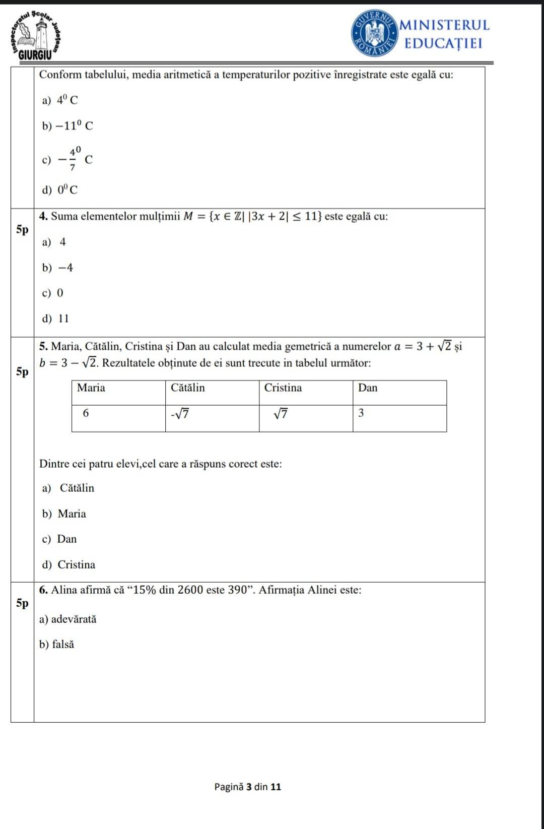 5. Patru elevi, Elena, Maria, George și Mihai, au calculat media geometrică a numerelor y= 3 -2√2 și y= 3+2√2 și au obținut următoarele rezultate: