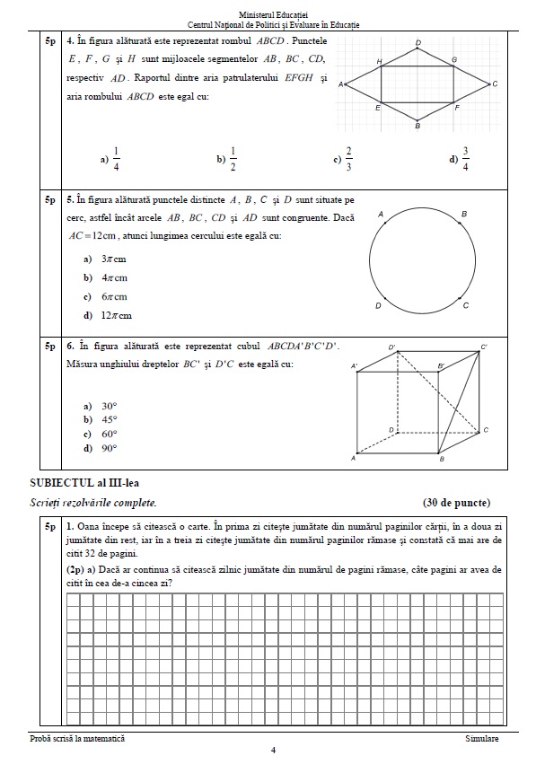 4 din 8 | Subiecte Evaluare Națională simulare Matematică