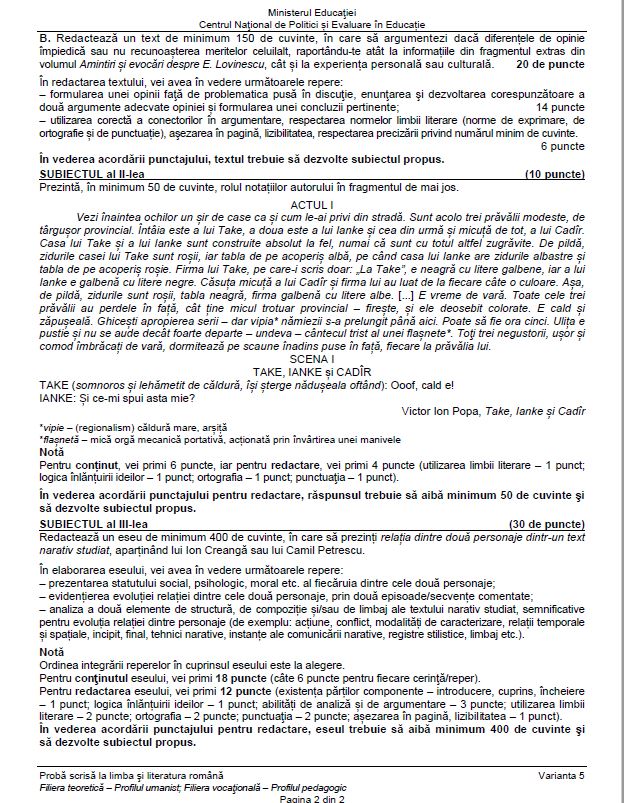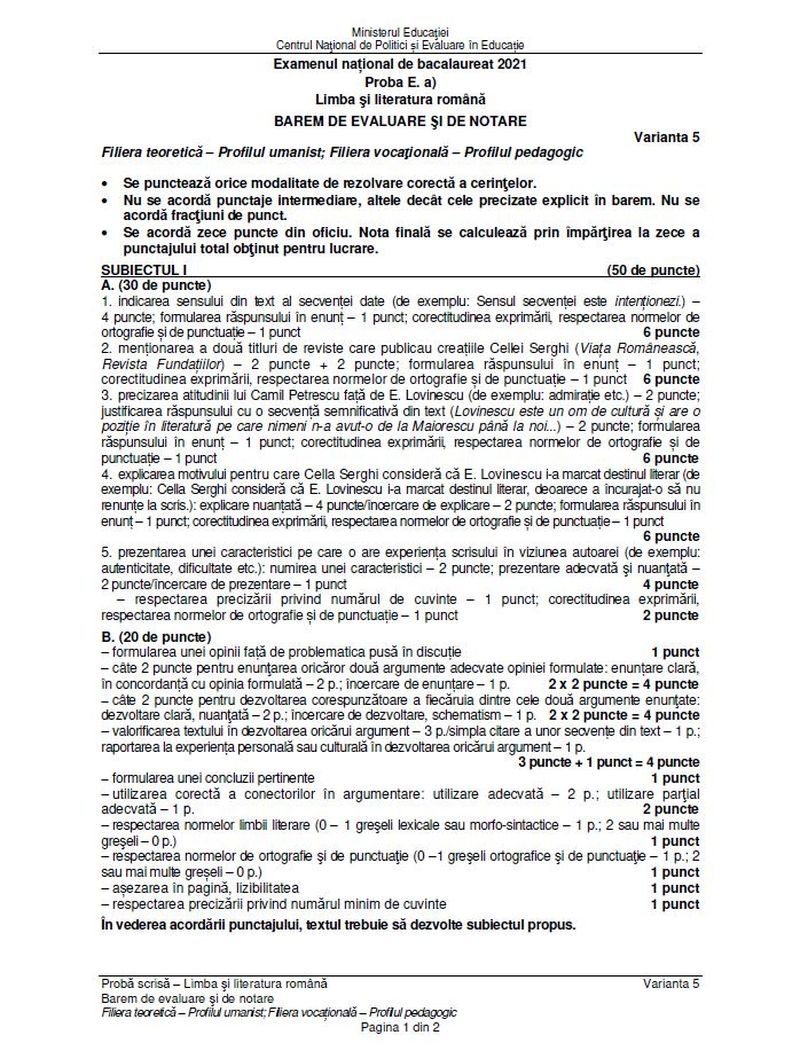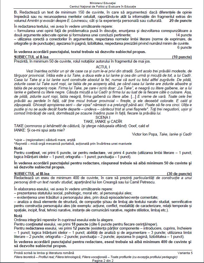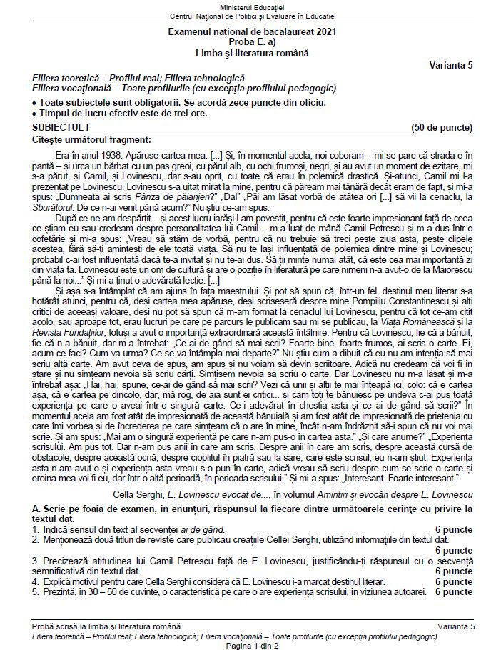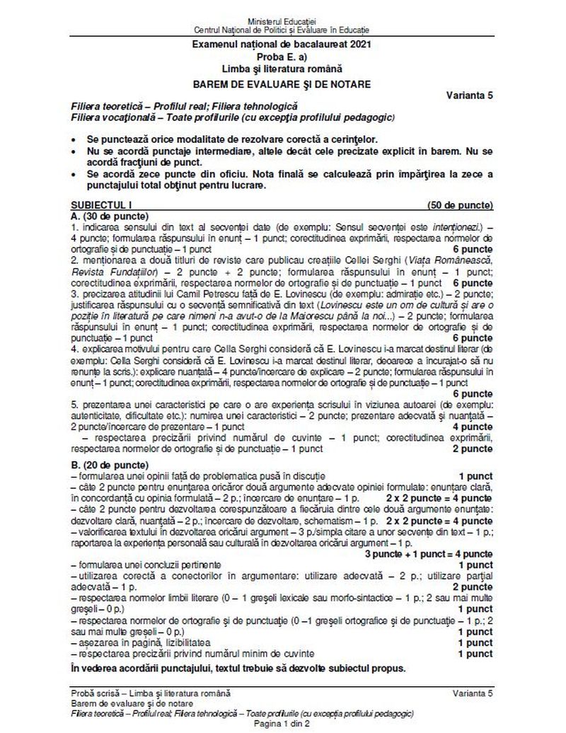 5 din 8 | Subiecte Română BAC 2021 sesiunea august - septembrie. Surpriză de proporții pentru elevi. Bareme de corectare