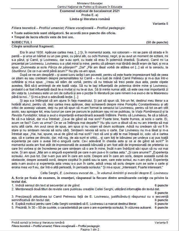 16 august 2021- Limba și literatura română- proba E.a)-