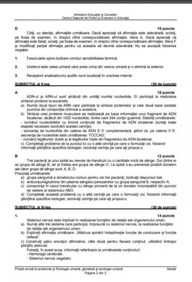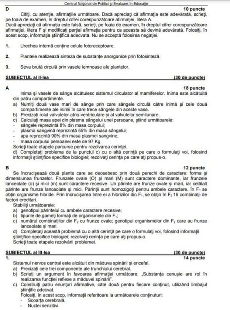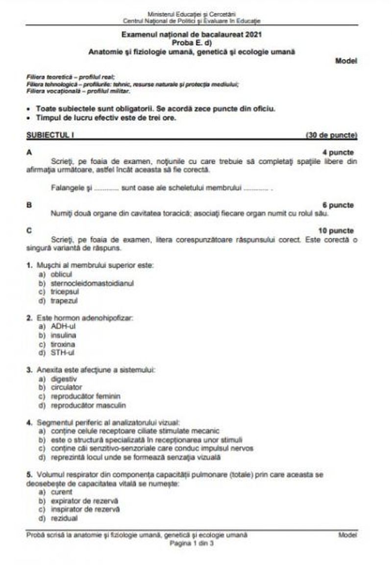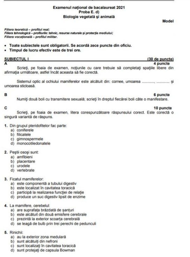 Iată câteva modele de subiecte la Biologie pentru simularea de Bacalaureat 2021: