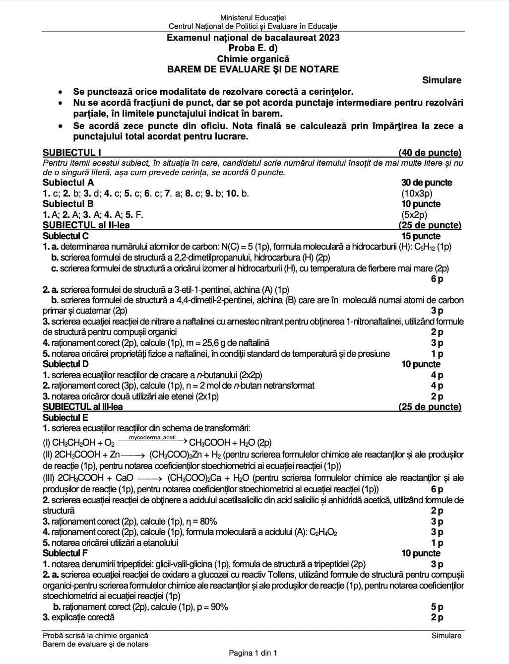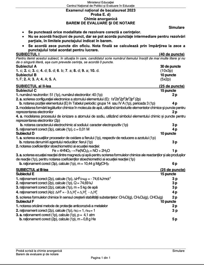 Modele și baremul de corectare pentru simularea la Chimie a Examenului Național de Bacalaureat 2023, pot fi găsite pe site-ul Ministerului Educației subiecte.edu.ro.