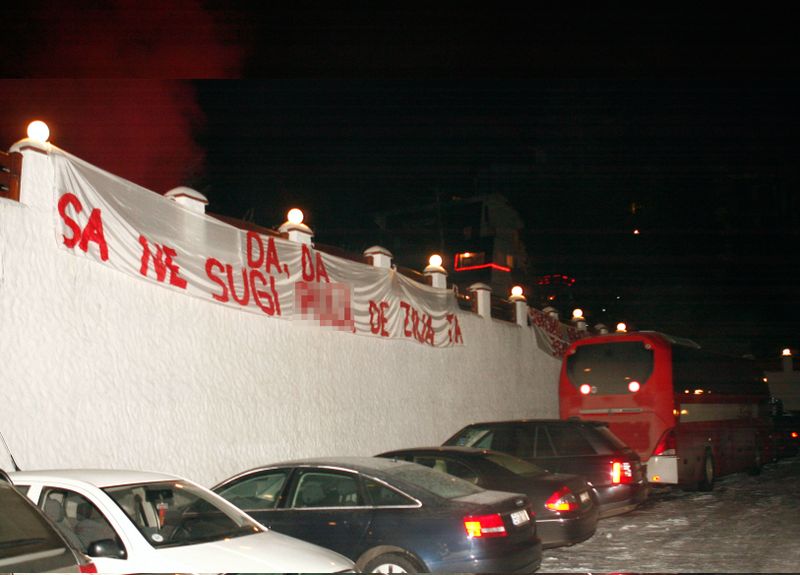 „Înainte de startul petrecerii organizate de Cristi Borcea sîmbătă seară, în Poiana Braşov, 10 suporteri au venit pe ascuns în parcarea hotelului şi au agăţat pe garduri mesaje contra şefului dinamovist.